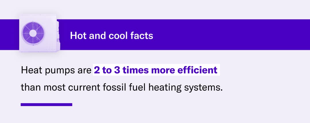 Heat pumps are 2 to 3 times more efficient than most current fossil-fuel heating systems, meaning they use much less total energy. And compared to your average air conditioner, most heat pumps, especially mini-splits, also use less energy for cooling. So again, even if your electricity supply is powered in part by dirty energy, you’ll use much less of it with a heat pump. And as the grid gets cleaner, your emissions will continue to fall.